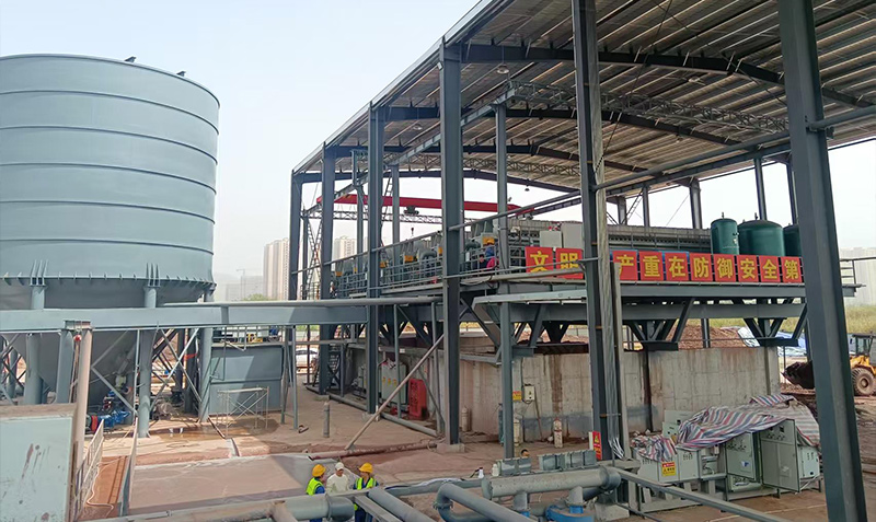 在實際處理流程中,洗砂產(chǎn)生的泥漿首先進入泥漿收集池,隨后被泵送至深錐泥漿分離罐進行初步沉淀分離。與此同時,清水池中的清水被抽入混藥系統(tǒng)(僅針對特殊泥質(zhì)需用藥情況),與絮凝劑充分攪拌。混合后的藥劑(若需添加)和泥漿在濃縮罐內(nèi)反應(yīng),加速固液分離。分離出的清水通過清水泵抽送至清水池循環(huán)使用,而絮凝后的泥漿則進入高壓壓濾機。在高壓壓濾機強大的壓榨力作用下,泥漿實現(xiàn)深度固液分離,壓榨產(chǎn)生的清水排出后可再次投入生產(chǎn)循環(huán),干泥餅經(jīng)傳送帶運送至指定區(qū)域進行后續(xù)處理。?