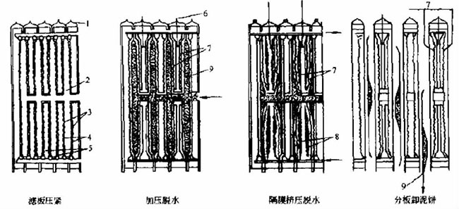 注:1-濾布結(jié)合處;2-濾框(板框腔);3-濾液通道;4-濾布;5-濾板;6-擠壓進(jìn)氣管;7-隔膜;8-壓縮空氣室;9-泥餅.